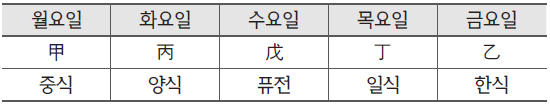 2) 丁은 수, 목, 금 중에 하루인데, 수와 금은 음식이 맞지 않으므로 목요일로 확정되고, 목요일의 음식은 일식이다. (유일하게 남아있는 화요일의 음식은 양식으로 확정된다)