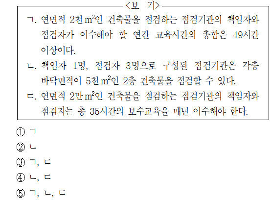한편, 연면적 2천m2인 건축물을 점검하는 점검기관의 책임자는 1명, 점검자는 2명이다. 매년 받아야 하는 기본교육 시간은 책임자가 35시간, 점검자가 7시간이므로, 이들이 이수해야 할 연간 교육시간의 총합은 최소 49시간 이상이다.