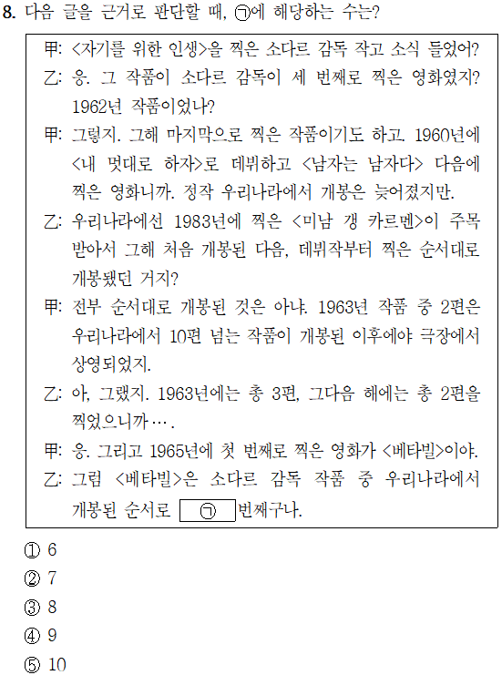 | [23행(가)-8] 2023년 5급 공채 (행정고시) PSAT 상황판단 가책형 8번 (0) | 2023.10.04 |