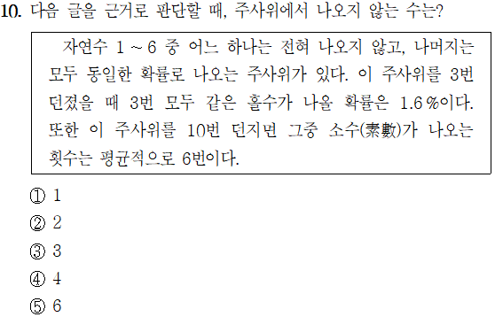 문제 해설 ▷ 정답 ① 1) 자연수 5개만 나올 수 있는 주사위를 3번 던졌을 때 나올 수 있는 경우의 수는 총 125가지(=5×5×5)이다. 1.6%는 분수로 표현하면 2/125이므로, 125가지 중 3번 모두 같은 홀수만
