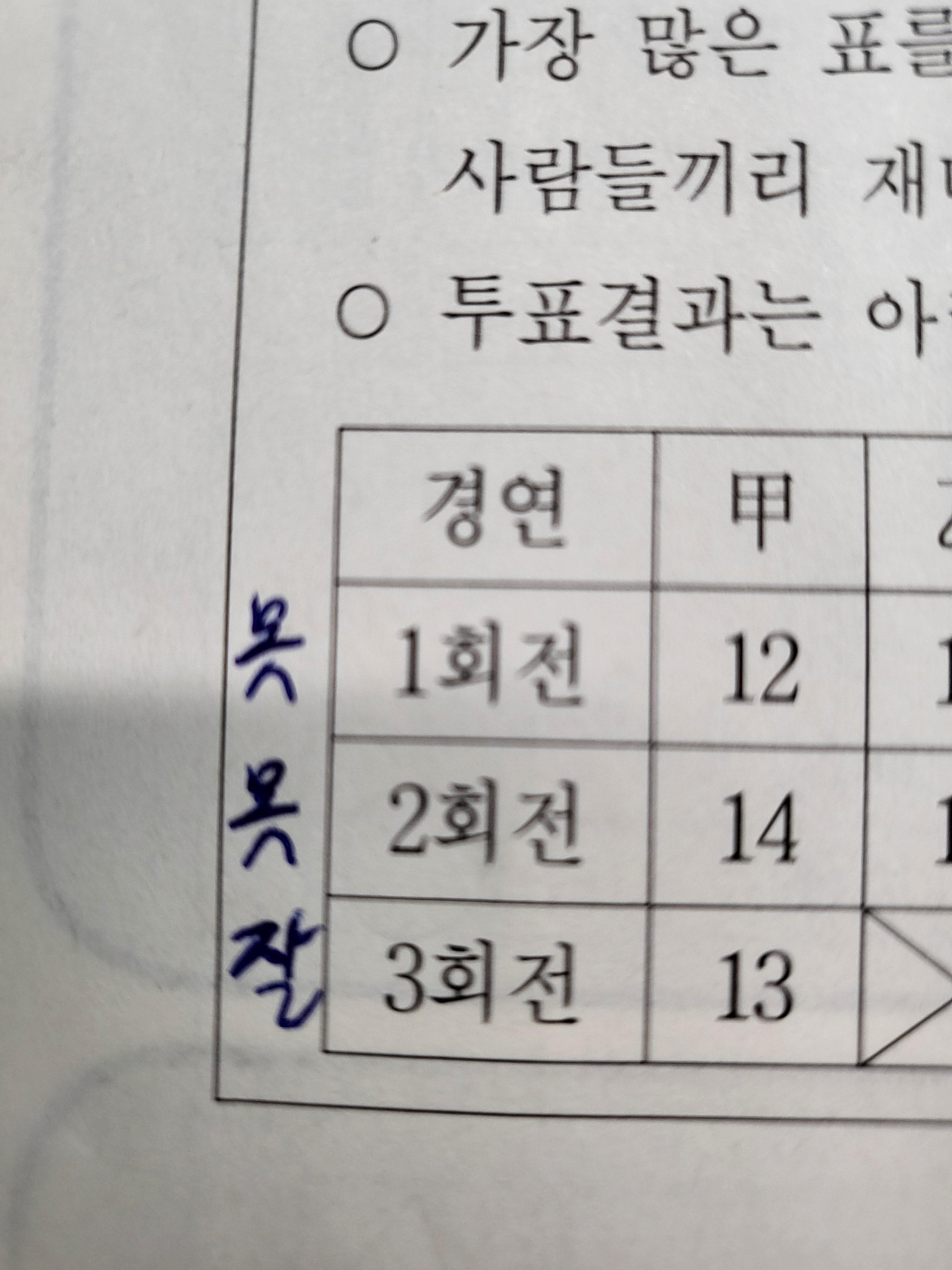 혹은 2회전에서 丁의 2표가 甲에게 가면 甲이 16표로 탈락자가 가능함.