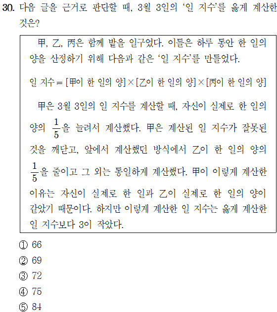 甲이 실제로 한 일과 乙이 실제로 한 일의 양을 라고 가정하고, 丙이 한 일의 양을 x라고 가정한 뒤 일 지수를 표현하면 다음과 같다.