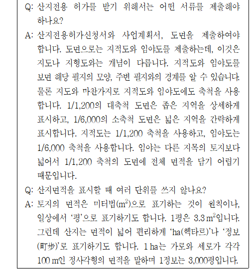 산지전용 허가를 받기 위해서는 산지전용허가신청서와 사업계획서, 도면을 제출하여야 한다. 그리고 도면으로는 지적도와 임야도를 제출하는데, 이것은 지도나 지형도와는 다른 개념이므로 지도와 지형도를 제출하여야 하는 것은 아니다.
